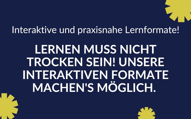 Lernen ist ein lebenslanger Prozess, und es muss keineswegs langweilig sein. Mit unseren interaktiven und praxisnahen Lernformaten wird Bildung zu einem spannenden Abenteuer. Diese Formate bieten eine Mischung aus theoretischem Wissen und praktischer Anwendung, was sie so effektiv und attraktiv macht.